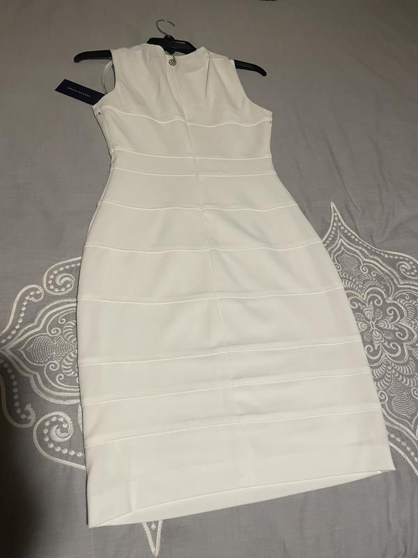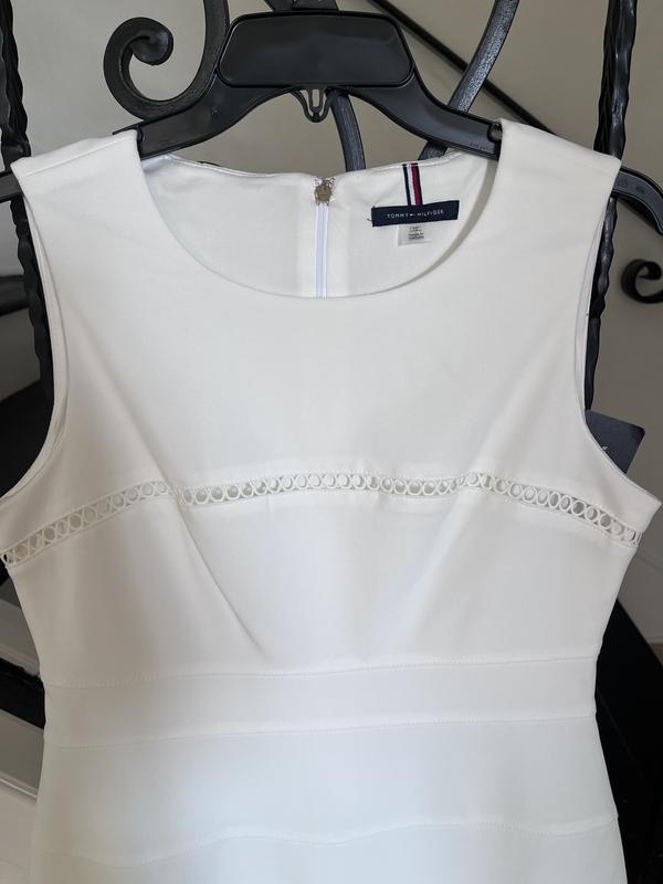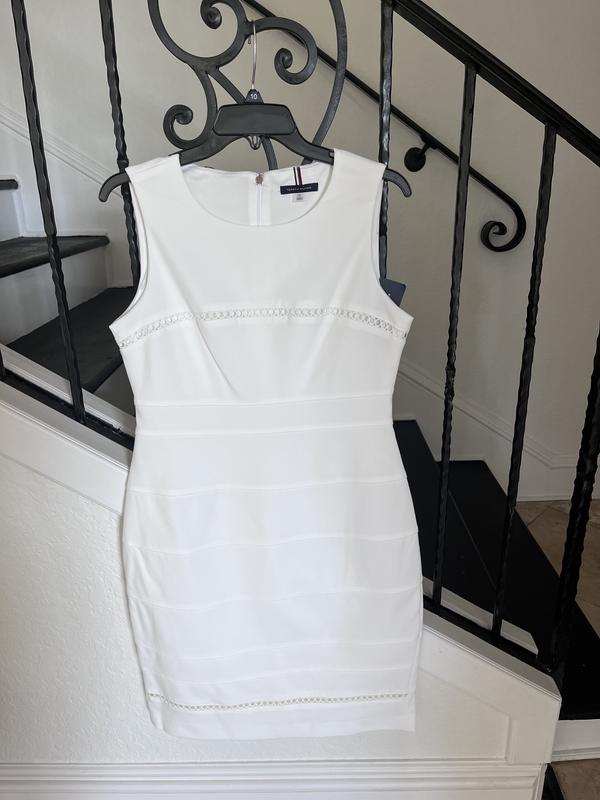 Geometric trim adds visual interest to this Tommy Hilfiger sheath dress with bandage-skirt styling.