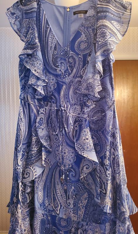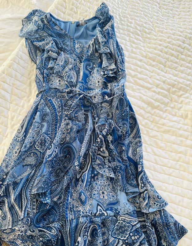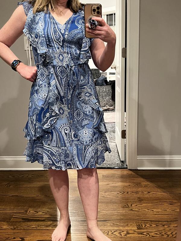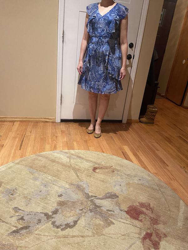 Dress is a lovely color. Length is good on me (5 ft 1) and has good coverage. I'm not sure how I feel about all of the ruffles.. they don't look bad, but it's just a lot going on. maybe just not my personal style. Great for a summer wedding.