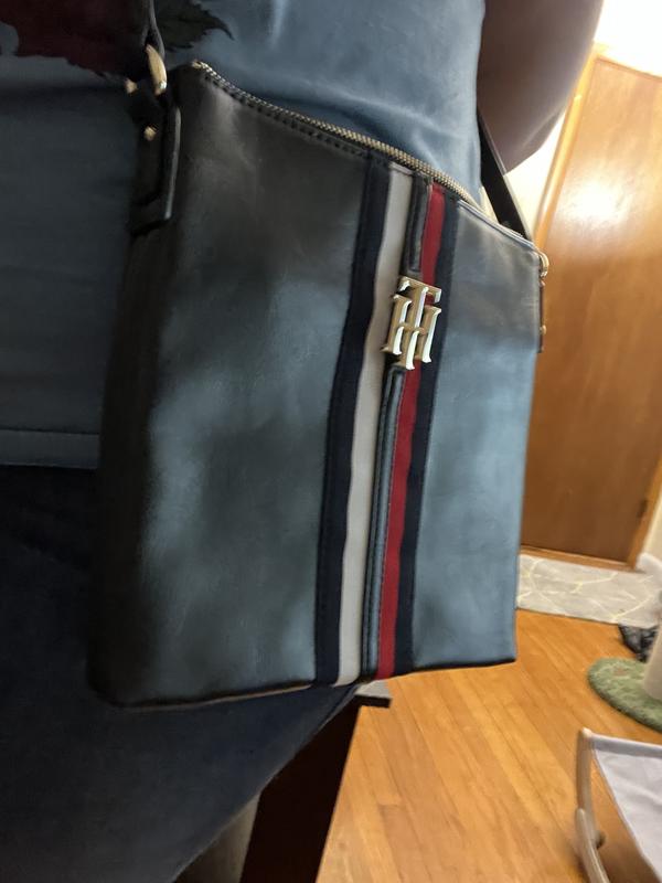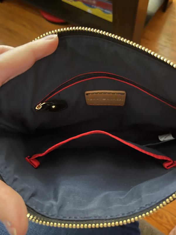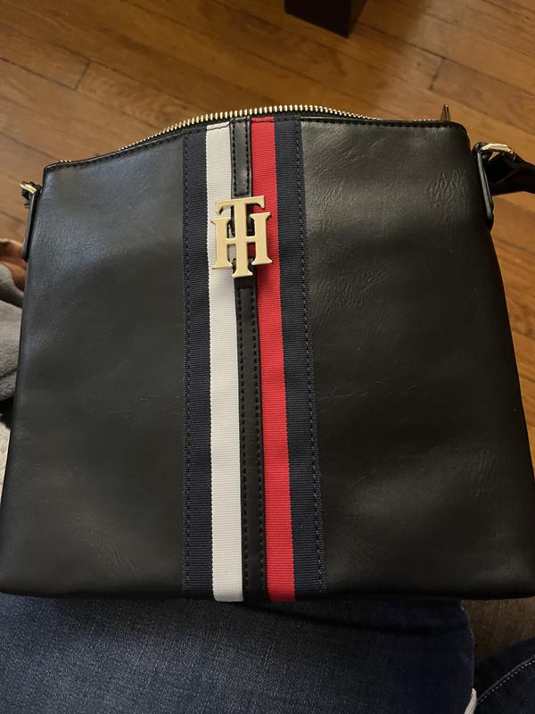 this is a cute little bag. I prove the leather, its a strong and durable bag. the black is perfect, and the classic Tommy colors add a little pop of color. plenty of space inside, and the pockets work out perfectly.
