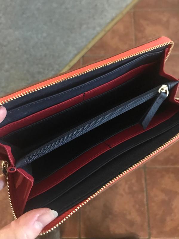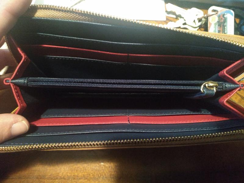 I typically like clasp wallets, so this is something new for me to get used to. The wallet is very nice quality with a thick sturdy zipper. The blue is actually a lot brighter than pictured, more like a royal blue, but I like it. It has lots of card slots and little pockets behind them to put money and such. It's a good size too. I'm really enjoying it!