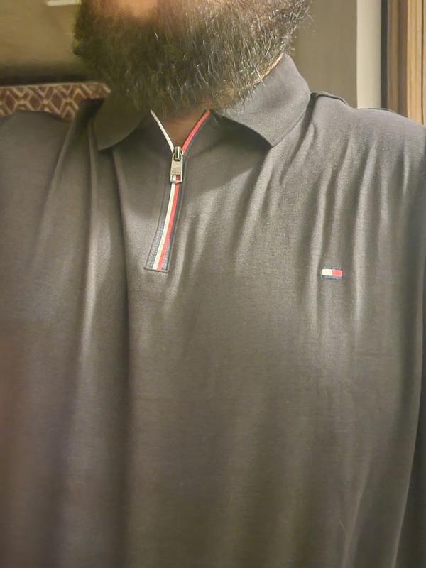 Tommy brand t-shirt made with cotton and other materials of very good quality is very comfortable and soft when coming into contact with the skin , it is also very light, it fits very well to the body and in the part of the sleeves it has elastic that fit very well to the arms, they have a V-shaped neck and also has a zipper which at the moment of closing you can see some beautiful and elegant lines of red and white giving honor and elegance to the brand it represents including a small logo on the left side of the front , can be used on any occasion or exit since it is very comfortable, the fabric is thick but fresh and not transparent, and does not transpire, I recommend it 100 x100 and it is very easy to take care of and wash the cleaning instructions you can have them using a QR code that is printed on the label I love the style and solid and deep color in dark blue of this pole, although it also has more variety of colors, sizes and styles. I washed it 3 times following the instructions and I am surprised that its color is still the same as it has not discolored.