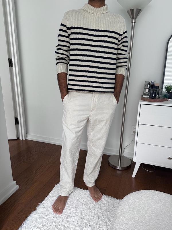 I received the Breton cotton stripe mock neck through Influenster and I'm quite pleased with it. The weight is perfect for transitional weather - substantial without being bulky, while warmth is surprisingly good for cotton, suitable for mild to moderately cool days. The cotton texture feels soft and quality, with classic stripes providing timeless versatility. Wrinkling is moderate after washing but relaxes with wear or a quick iron, and care is straightforward with machine washing on gentle cycle. Overall, this is a solid wardrobe staple combining French-inspired style with everyday practicality, with only minor wrinkling keeping it from a perfect score.