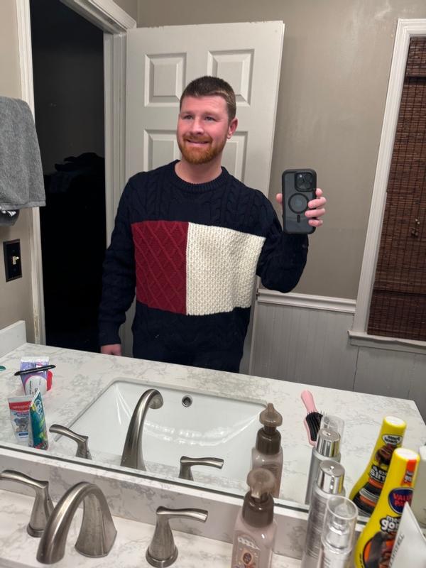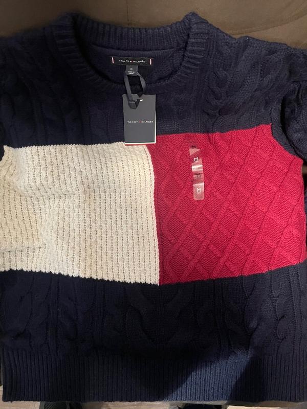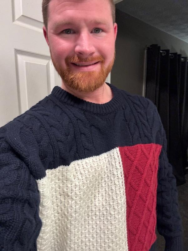 This tommy hilfiger cable flag sweater is super soft and comfortable. This sweater is crafted from a wool blend making, making it an essential choice for winter time. The sleeves fit just right and the stomach area fits loose giving you room to breath. The style of this sweater is very awesome. Like how they did the flag on it. Would recommend to anyone that wants a awsome sweater for the holidays.