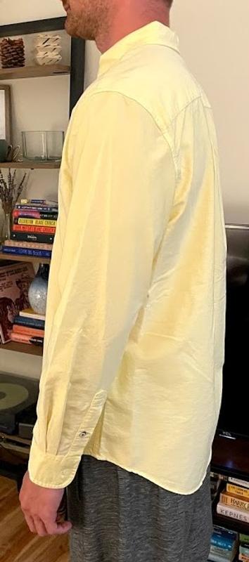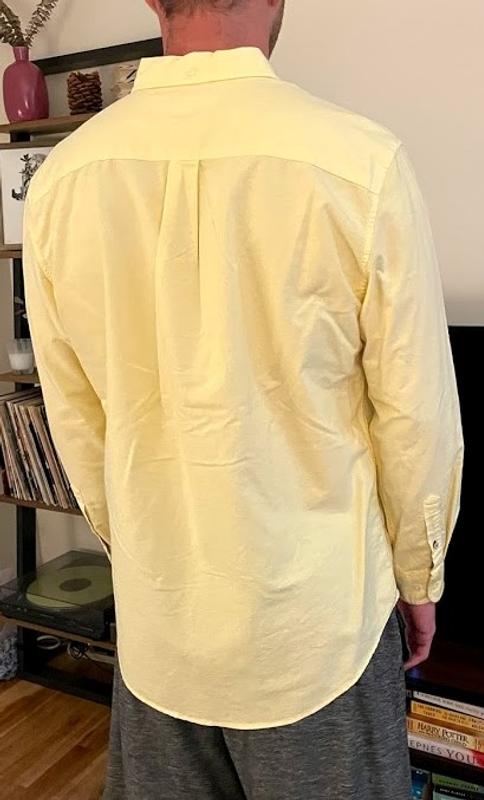 This shirt could have been great. The color is bright and the fabric is thick and soft. It feels like a high quality shirt. The extra red, white, and blue stripe up the edge of the button side of the shirt really make it feel a bit nicer. All good but...it, like most shirts these days, is either too long or too short. It’s a bit too long to keep it untucked, and when tucked in, the last button is about 1” above my belt. Ok when you first tuck it in, but when you start moving around, it starts spreading out and looks bad. Bummer because otherwise it is a great shirt!
