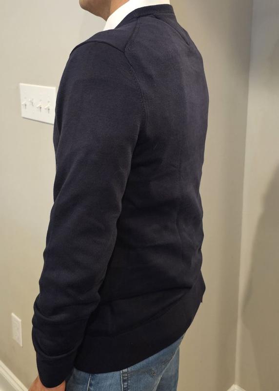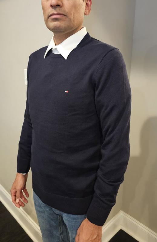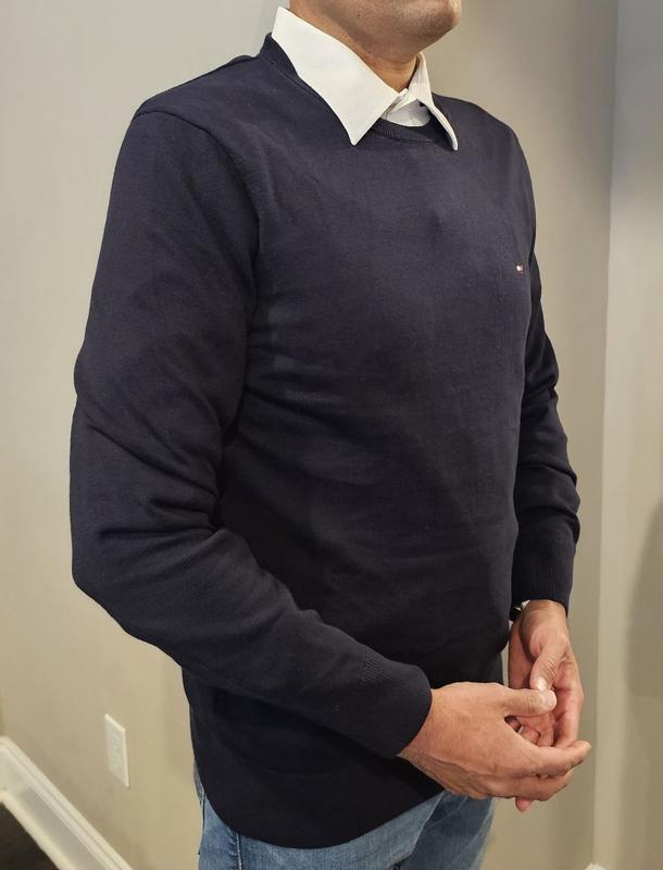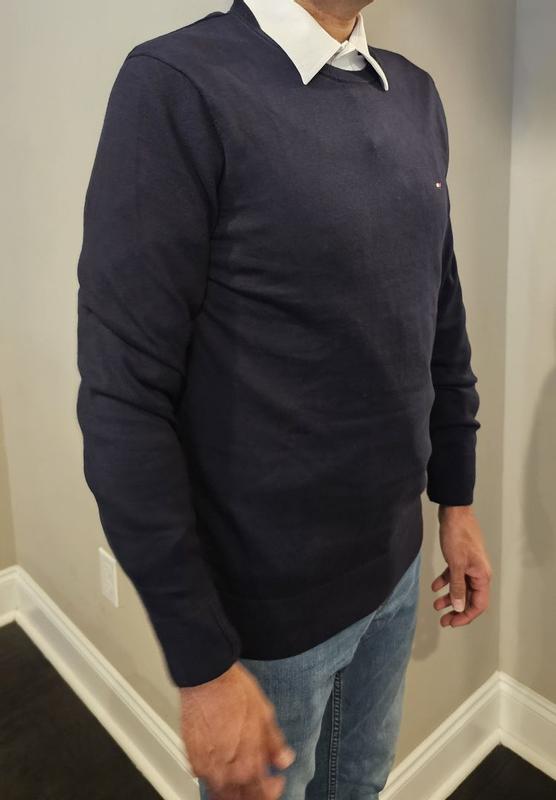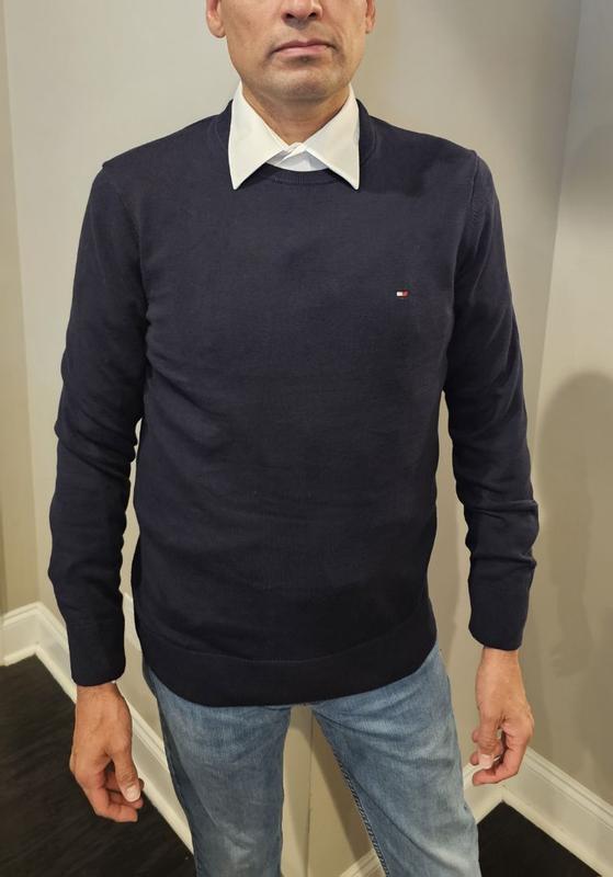 This Tommy sweater is perfect for formal look in winter season. This is crewneck sweater so looks great with collar outside and even with tie inside. My husband wears large but this medium fit him perfectly. The material looks soft and smooth. Does not feel itchy. I love Tommy’s sweaters as color will not fade and does not peel. My husband loves this sweater and started wearing it in office already!! I will buy these in different colors for my husband.