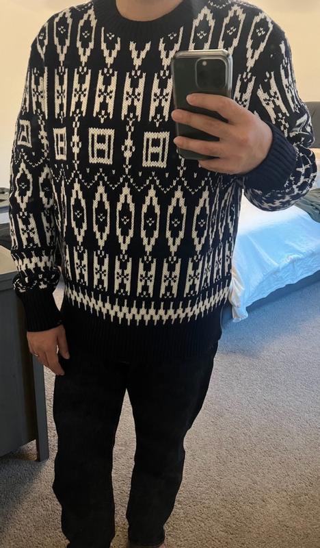 The sweater is made of 70% wool and has a very soft hand feel. The knit is a loose gauge knit while still being warm. The sweater is a relaxed fit. I am 5’8 and 150 lbs I’m wearing a medium but could’ve sized down to a small for a more classic fit. The all over print is a festive design so I probably wouldn’t wear it outside of November and December. There are no logos besides a small Hilfiger embroidery on the left sleeve so you wouldn’t know that it is a Tommy Hilfiger piece of clothing unless you looked closely.