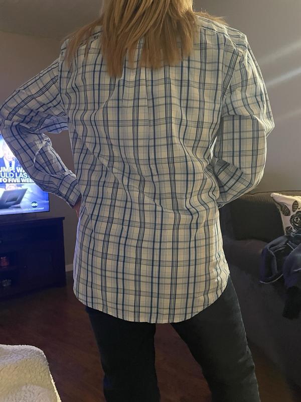 I’ve worn a lot of plaid shirts that either feel stiff or look a little too old fashioned but this one lands in a nice middle ground. The light blue and white check is clean and easy to match; it works with jeans, chinos, or even under a sweater without looking complicated. The button down collar helps it stay structured, so it looks put together even if you’re wearing it casually. Fabric feels like a typical cotton blend: breathable and comfortable, not scratchy; but it will wrinkle if you pull it straight out of the dryer and skip the hanger. Fit is pretty classic, not super slim; if you’re between sizes and want a sharper look, sizing down might help, but if you want comfort and mobility, your normal size is fine.