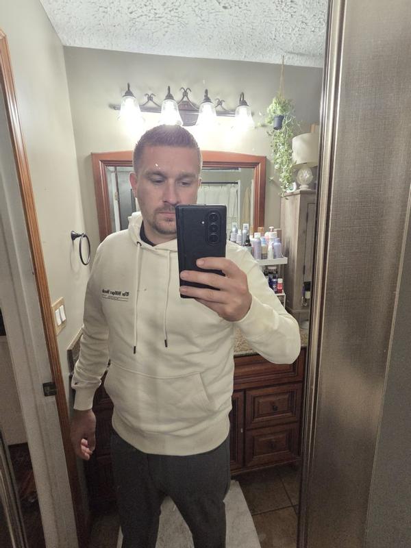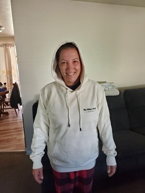 It’s nice and warm and comfy. I like the hood and the font of the letters and the logo on the sleeve. It feels good and fits good. Good material too and worth the price and like it will last.