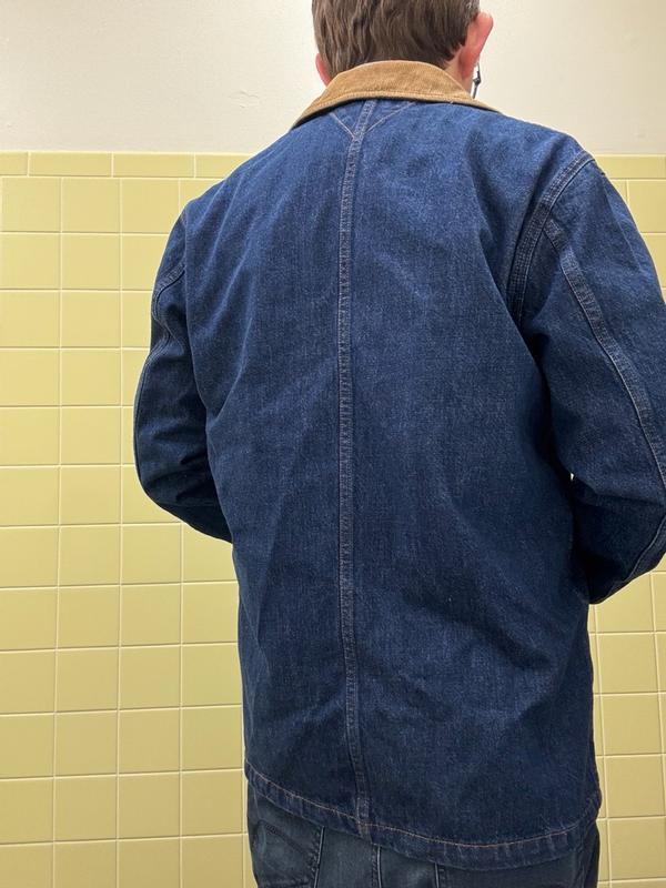 I have been looking for a denim jacket like this for a while now, so glad I got one on here! It fits perfectly —I usually fit in-between a medium and large— for me. I can roll the ends of the sleeves once and it has the same corduroy style as the collar. There are 2 breast pockets, one on the inside and one on the outside, both are easy to access and use. All in all a great jacket.