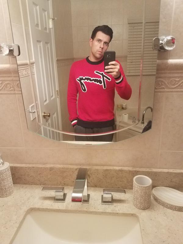 This sweater has quickly become a staple in my wardrobe. It is light enough to wear in the fall and spring, warm enough, with layers, to wear in the winter and stylish enough for year round use. Best of all, it is versatile and can be dressed up or down. It is a statement piece. The sweater is a vibrant red with a fuzzy logo on its face. The logo is playful, not flashy, and adds fun and flair to any look. The sweater employs quality, durable material that is comfortable to the touch and is not itchy or irritating on your skin. And it washes well (without dying anything else)! My one complaint is that the navy border is so dark as to be easily confused with black which can make pairing it with appropriately matched pants difficult. That aside, the sweater is the centerpiece of any outfit and has garnered a number of compliments. Highly recommend!