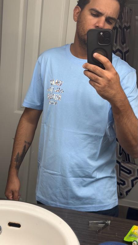 Material feels great. This shirt is adorable and comfortable. The blue is really nice goes great with my son’s eyes fits a little big for him. Let’s see what happens after we wash it.