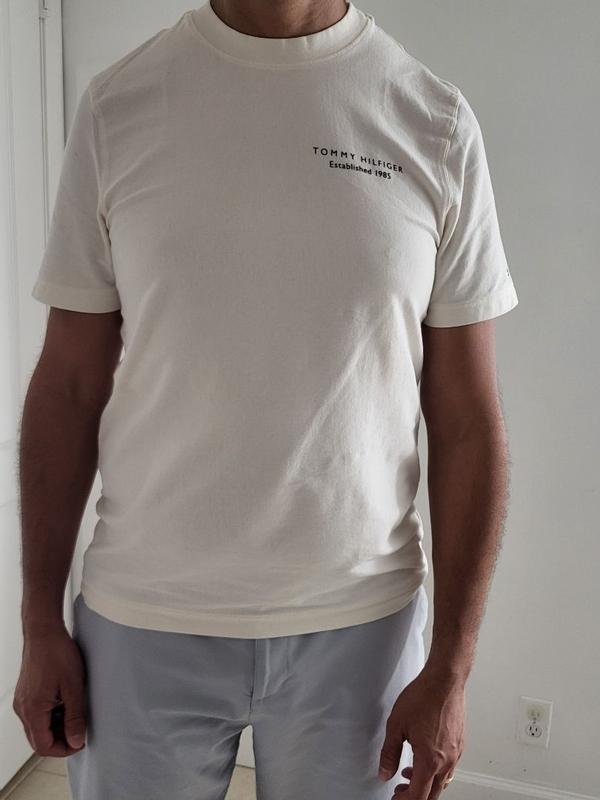 Such a classic Tommy Hilfiger t-shirt. The logo is in the front and the large city print is on the back. The off white/beige color looks great with almost all the colors and the material is soft, and slightly thicker than most t-shirts. It’s true to size and also washes nicely if you follow the wash and care instructions. The material is breathable and not too sheer.