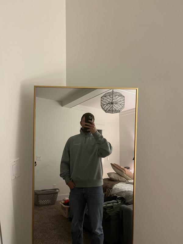 This half zip looks even more sharp in person . Actually going to have my son wear it as he really liked the style himself . It's true to size with a lighter looser fit at the bottom . Fabric is really soft and durable so not gonna fall apart in the wash. The pull overself is just really aesthetically attractive.