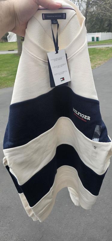 This sweatshirt from Tommy Hilfiger is quite heavy and warm for colder months. Personally, I am not a big logo guy, so I find the brand name printed on the front to be unsightly. The photo makes it look as if it would be a longer fit, but instead it is very boxy and almost too short. Seems it was cut like a women's oversized crop shirt rather than a regular men's. I probably will just wear it at home since it rides up and exposes my midsection when I lift my arms, or just give it to my wife. Unfortunate, because it is a nice thick material, but the fit is not what I expected.