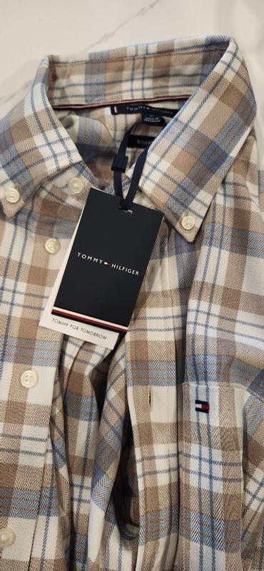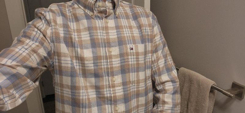 This is an awesome shirt! It is moderately thick, almost like a light flannel shirt, but it is cut and tailored like a dress shirt. This will be a great option to stay warm AND look fashionable for the Fall season. The cut is marketed as "Regular", and while I typically prefer a slim fit for skinnier frame, this cut isn't too baggy or bulky in the arms. Should fit all but the "extra weight" body types. The design is beautiful and there is only a small Hilfiger logo on the single chest pocket which is subdued. Highly recommend this shirt. I'll be on the lookout for other designs in this line!!