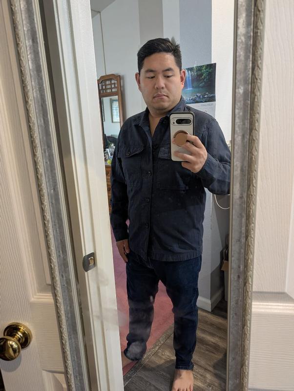 This Shirt Jacket has very good quality with 100 % cotton. The look of this product shows quality at first glance and true to size allowing more of a tailored look. This fit is refreshing as most items in this category are only oversized. Excellent stitching and I confidently recommend this product.
