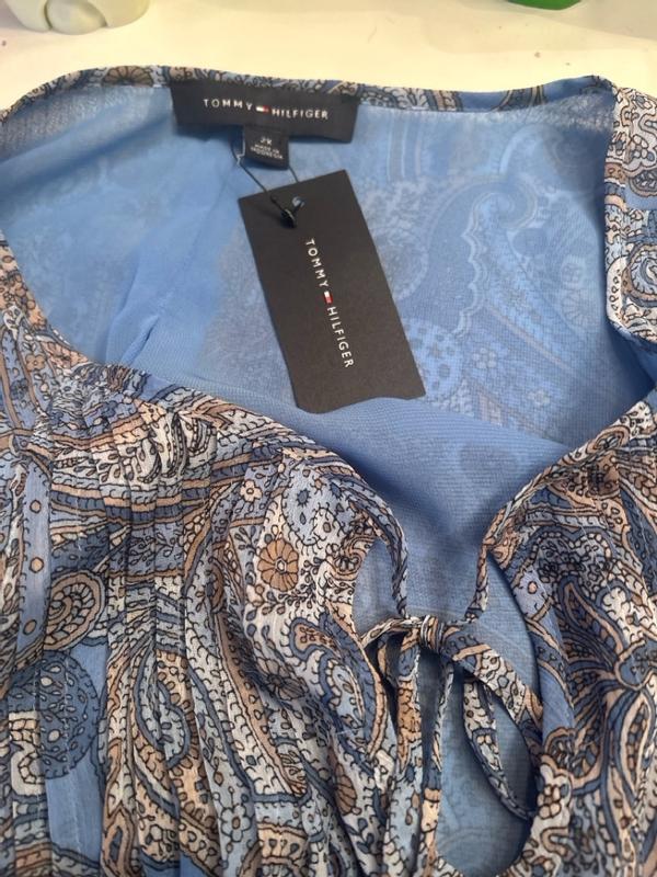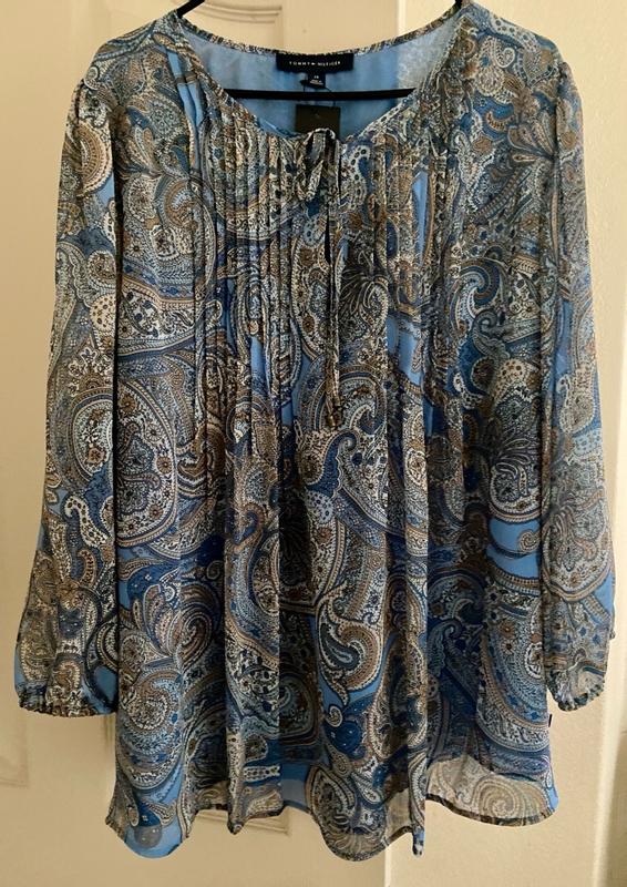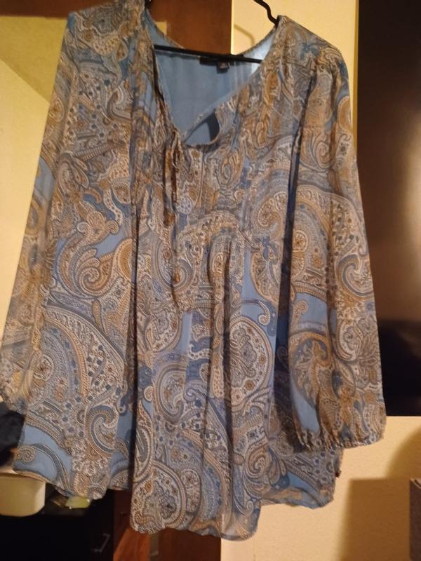 Beautiful and vibrant print. Fabric feels lightweight and breathable. Very versatile styling options for this blouse. Has become a staple in my wardrobe.