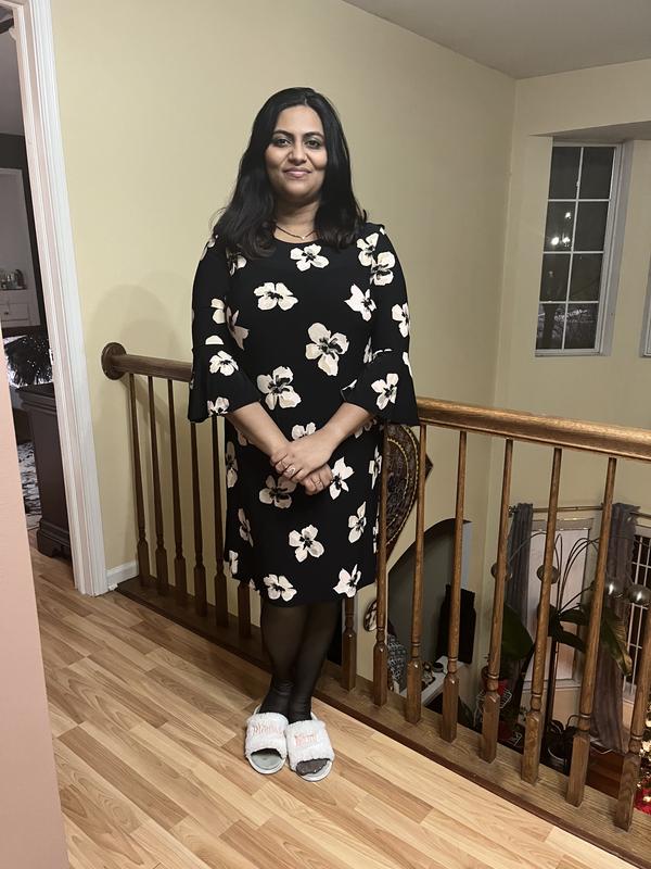 I loved how the dress flatteringly fit on me. The lightweight material and the pattern worked seamlessly together. I felt it was just the right length. The bell sleeves gave me just enough coverage for my arms. Not too hot, not too cold. Great for the fall.