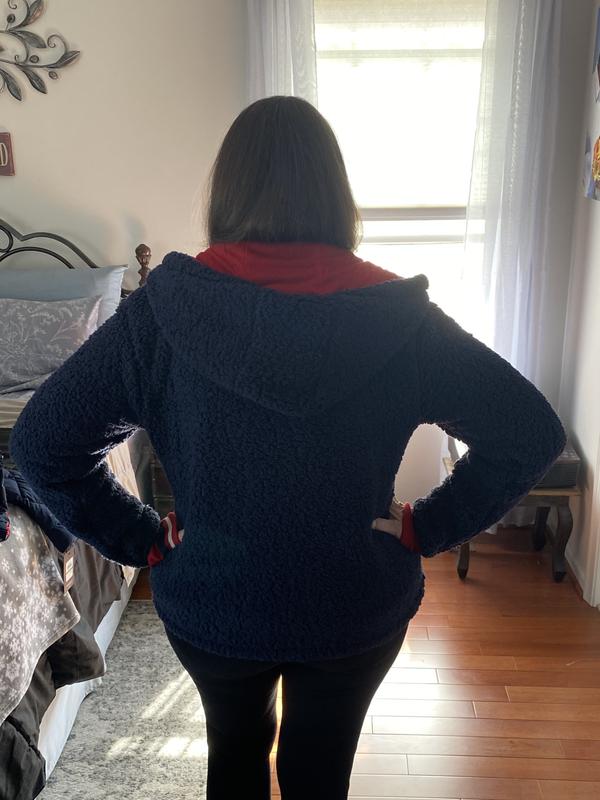 This jacket is a true navy with nice detailed red and blue striped cuffs. The length hits right at the hip and it feels comfortable. Although lightweight, it is a very nice fall sherpa jacket for warmth.
