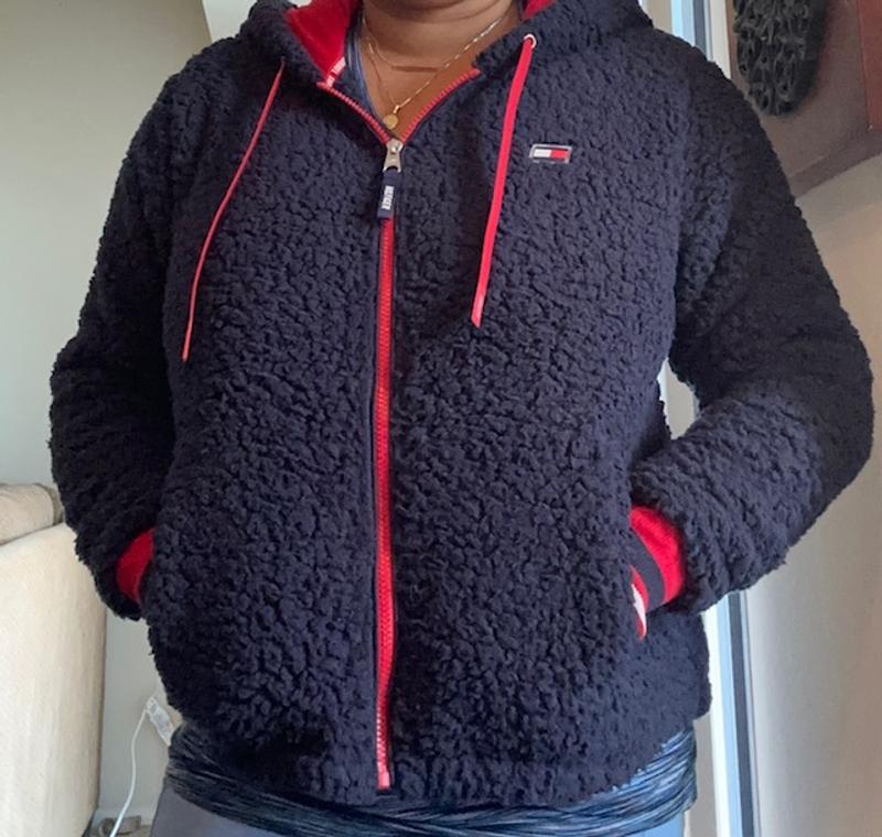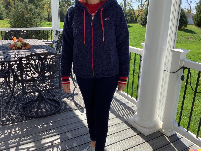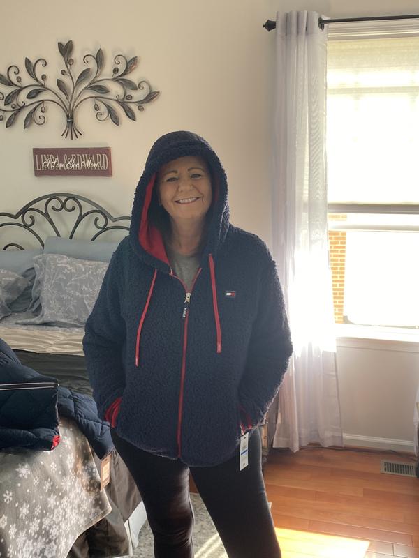 I think this hooded jacket is cute! It’s soft and will pair well with jeans or sweat pants. I thinks it will be nice on a a youthful frame.I don’t like it for myself as it makes me look heavier than I am.I wear a misses size 10. Sherpa is unforgiving on me.