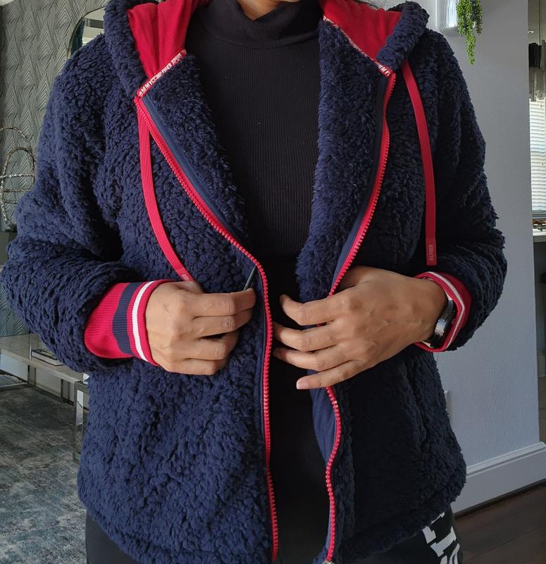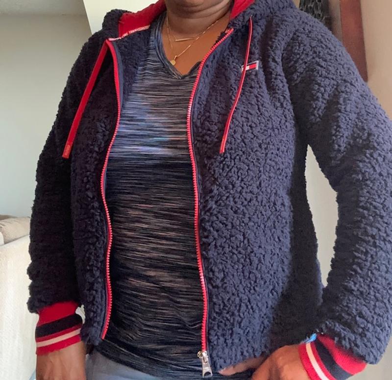 This jacket is a beautiful blue with red accent elastic cuffs. It’s stylish and super cozy. It’s an unlined jacket so it can be worn as a sweater or layered when temperatures are colder. It’s a classic style zip hoodie with sporty accents that look stylish yet would never go out of style. It’s very soft and washes well. This jacket is an item in your closet you could remain in your wardrobe for years to come.
