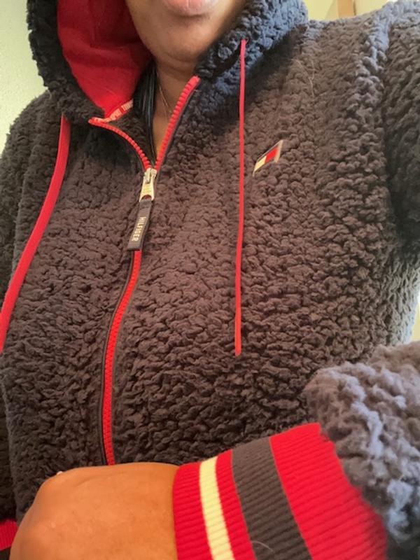 This jacket is so light and warm. The material is nice not like any other cheap sherpa which looses texture. Love the color and the zipper is smooth. Love the colors and hint of red on the edges. I wear size small, this jacket is true to size. Percent for layering. Nice jacket to keep you warm its super light weight does not look bulky at all, perfect for gym, shop around, in house and anywhere it's very comfortable. It's great jacket in and out.