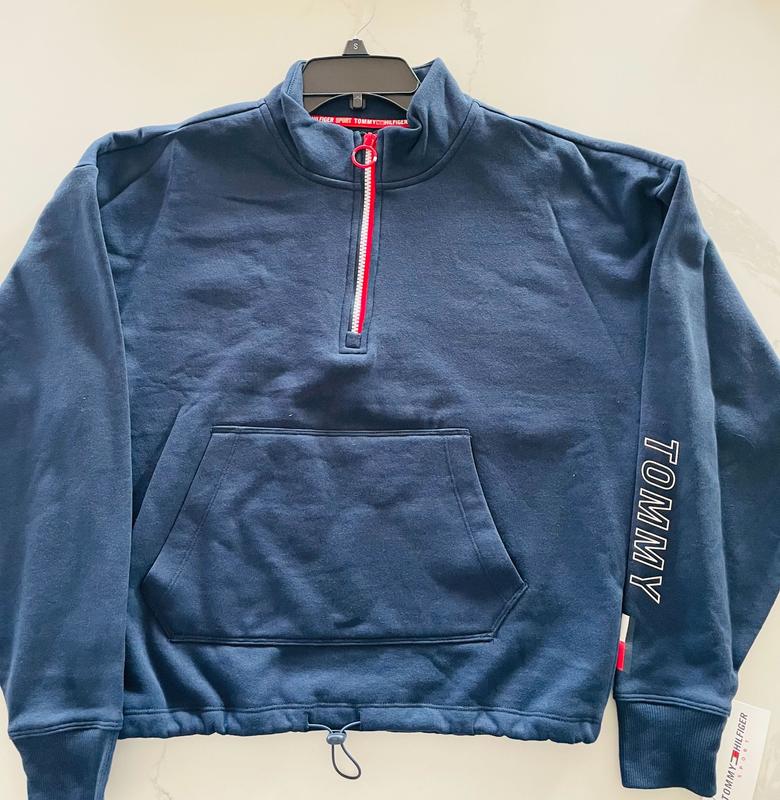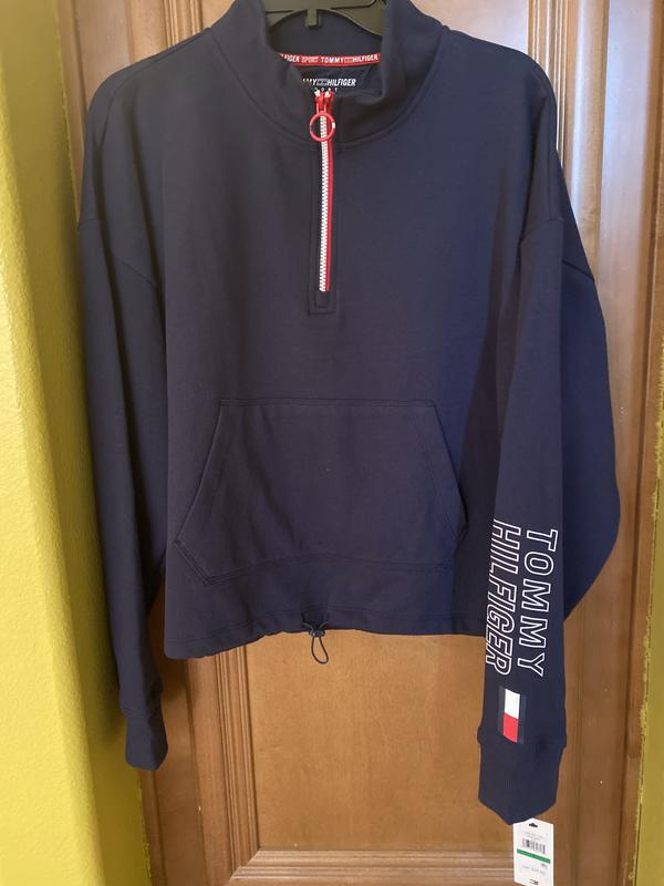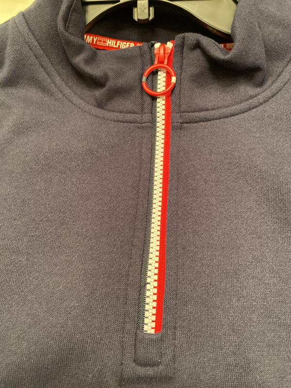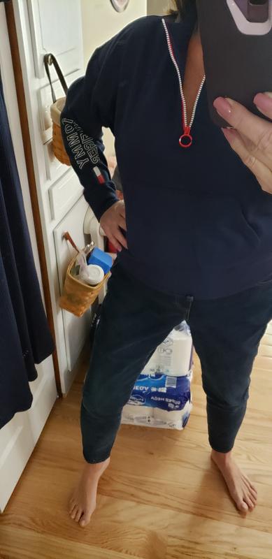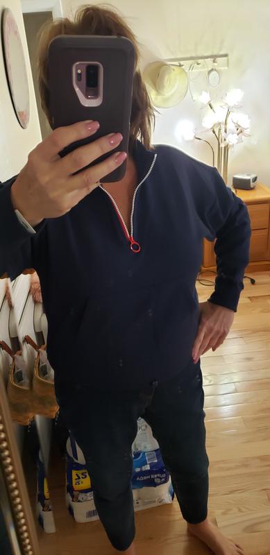 For someone like me who hates hoodies, this is the perfect style sweatshirt. I am almost obsessed! It’s well-made and mid-weight. Perfect for the Arizona winter months. The quarter zip in red and white adds the right pop of color and is of quality material. The collar stands up firmly and takes this up a notch or two above a crew neck sweatshirt. There is a slight bit of room to this sweatshirt, compared to other Tommy Hilfiger tops I have, making it super cozy. The sleeves are the absolute perfect length for me. And the elastic drawstring at the waist is a nice touch. There is one downside, and it is big enough for me to deduct one star. The overall length is just too short. I’m 5’7” and this sweatshirt sits just below my waist. If it were just a tad longer, I’d buy this in every color available.
