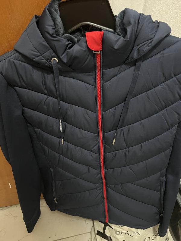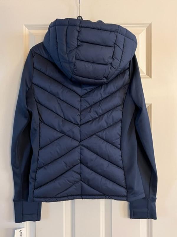 Hybrid outerwear jacket with silicone logo patch. This is a well made quality jacket. It is lightweight yet sturdy enough to keep you warm. It is soft with a fleece type inside collar. A hybrid jacket it has combines a puffer jacket with stretch knit sleeves that have slots for your thumbs to fit through. Two outside pockets, but no interior pockets. Also has a comfortable attached hood. The zipper pulls up and fits into a little hooded pocket so the zipper isn’t poking you. It is a very nice deep navy blue color and the logo on the sleeve is the same color as the sleeves so it does not stand out on the sleeve. Comfortable, warm, stylish and looks great.