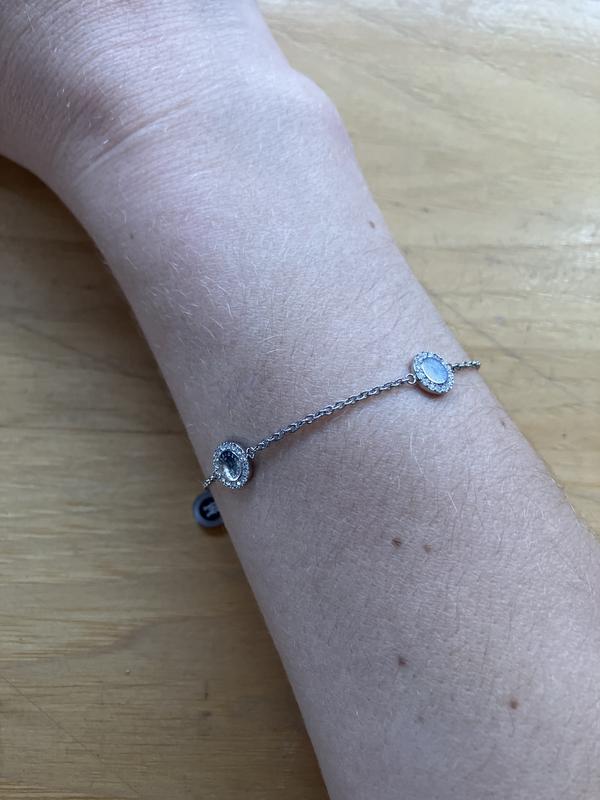 Introducing the epitome of chic sophistication: Tommy Hilfiger's gold-tone bracelet adorned with mini crystal-embellished circles, each center proudly showcasing the iconic ""Hilfiger"" logo.