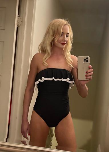 This swimsuit is not only stylish but also flattering. The black and white flounce make it fun and flirty. The ruching in the midsection, along with the black color helps hide problem areas. Additionally, it gives full coverage of the bust and bum so you’re not spilling out in all the wrong places. The suit has a removable strap which can easily be taken off to avoid tan lines or put on to provide additional support for activities. I can’t wait to wear this swimsuit this summer!