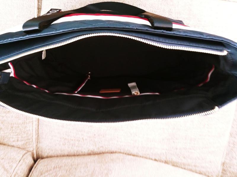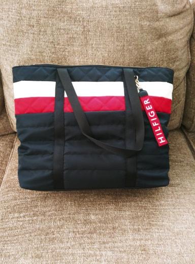 This tote bag is super cute. It has the Tommy Hilfiger colors. The material is made of something that's easily to wipe off with a cloth if it gets dirty I really like that because sometimes my son get stuff all over my stuff LOL so this will be super easy to clean. Next stuff I always love to carry big purses and totes in this is huge! I could literally carry all my stuff that I would normally carry in a purse plus All My Sons baby stuff some diapers or whatever without having to carry diaper bag as well. Easy to carry around real lightweight easy to clean overall great material ,greatbag!