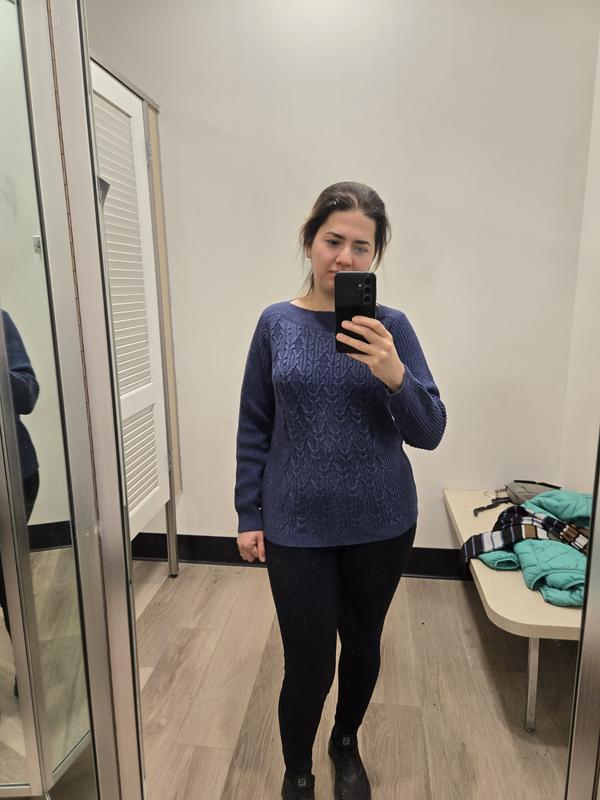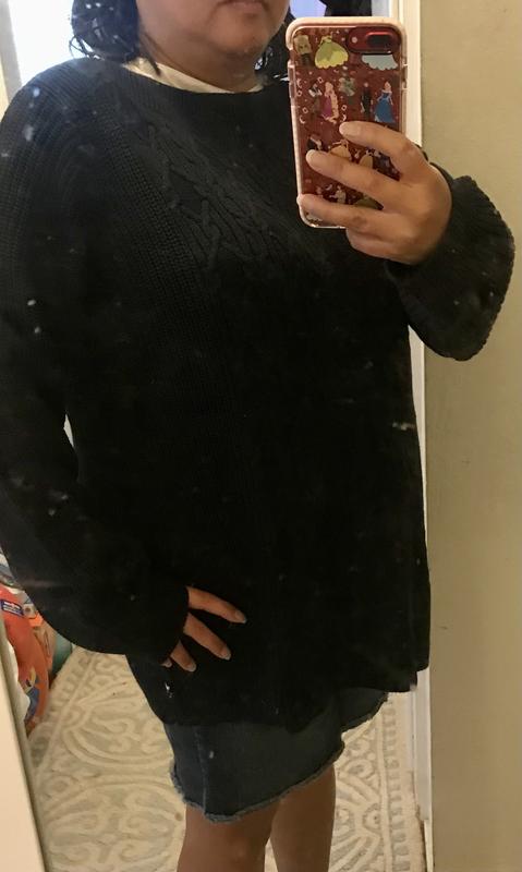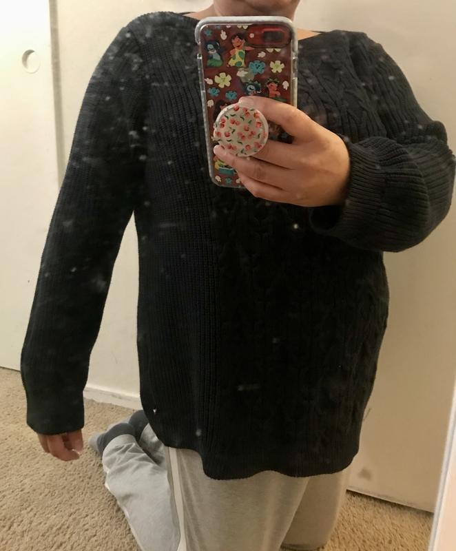 This is a lovely sweater that hangs just right. It is not bulky, it is not tight. The colors, except for the pastels, are deep, rich colors. The knit is also large and elegant. It dresses up anything. I tried to order more in different colors but they were sold out.