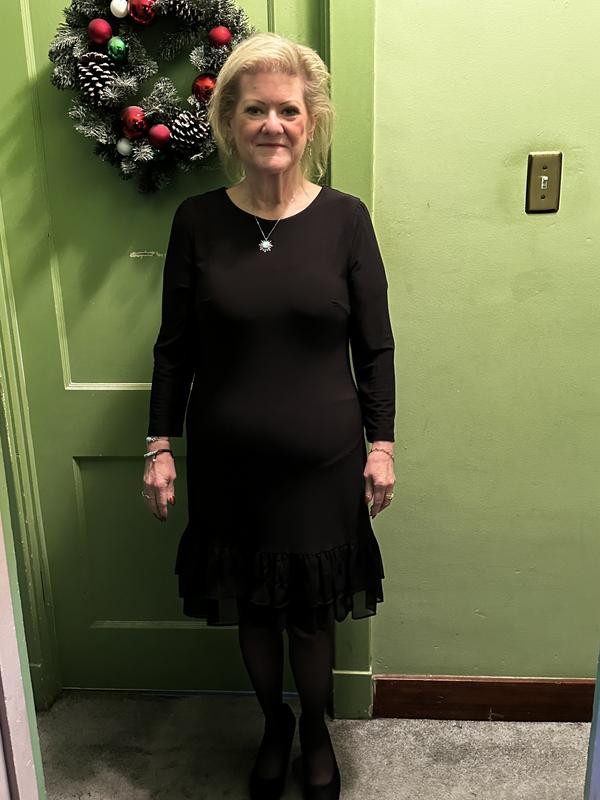 Very nice black dress that you can dress up or dress down. I am 5’ 3”, weigh 126 pounds and ordered a size 10. I could go down a size, but I like my dresses a little loose. Very pleased with the quality of the material.