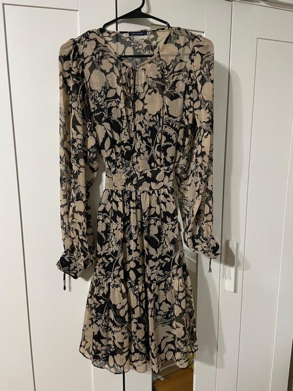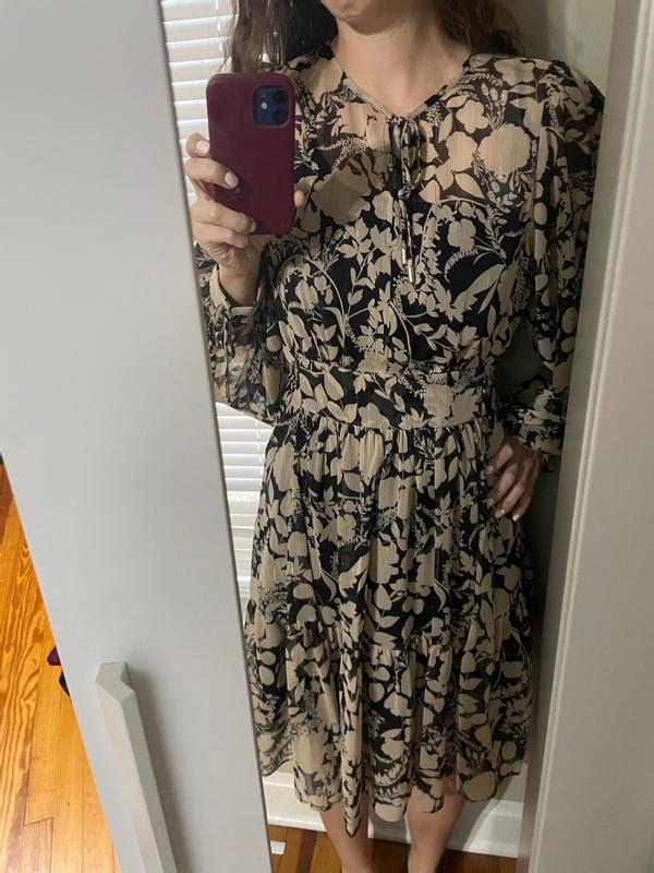I love this dress! first impression was the colors, I was a little worried that it would be close to skin tone but it’s great! and I love the gold accents. the fit was good too. length hit right above my knees (i’m 5’3”) so great for work! the ties on the neck and back are a nice touch as well, making the dress having a more individual fit. it’s sheer and flowy with a slip underneath, perfect for spring and summer!