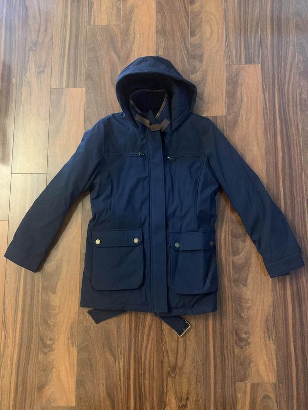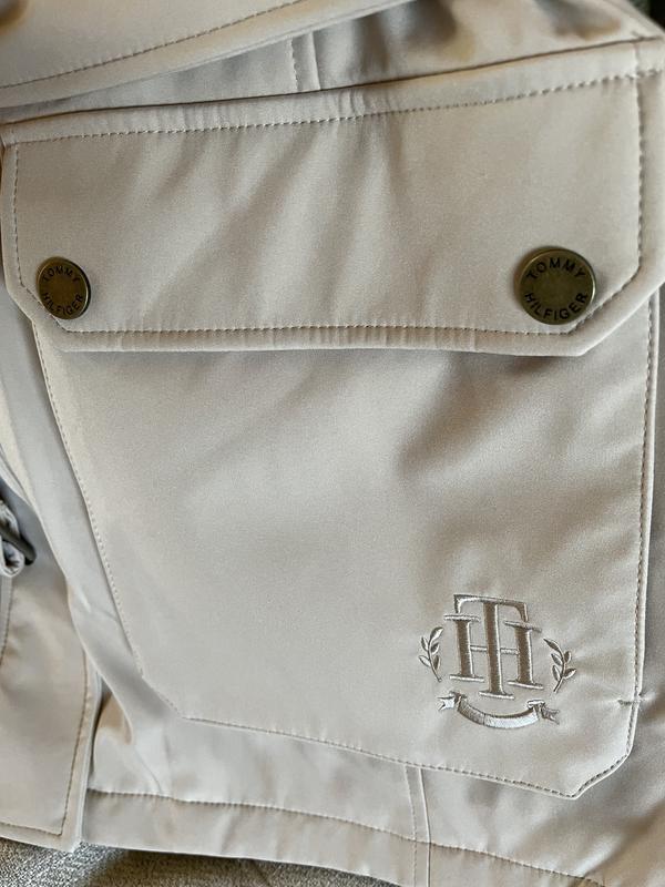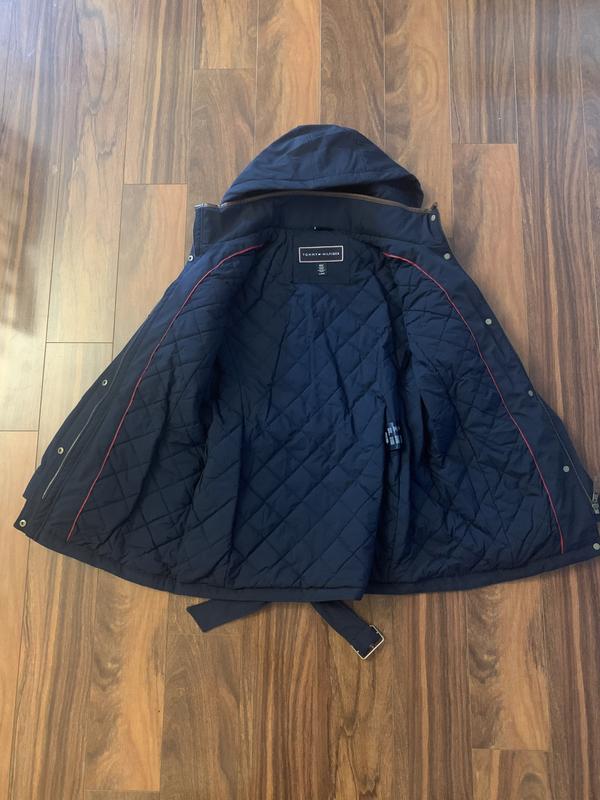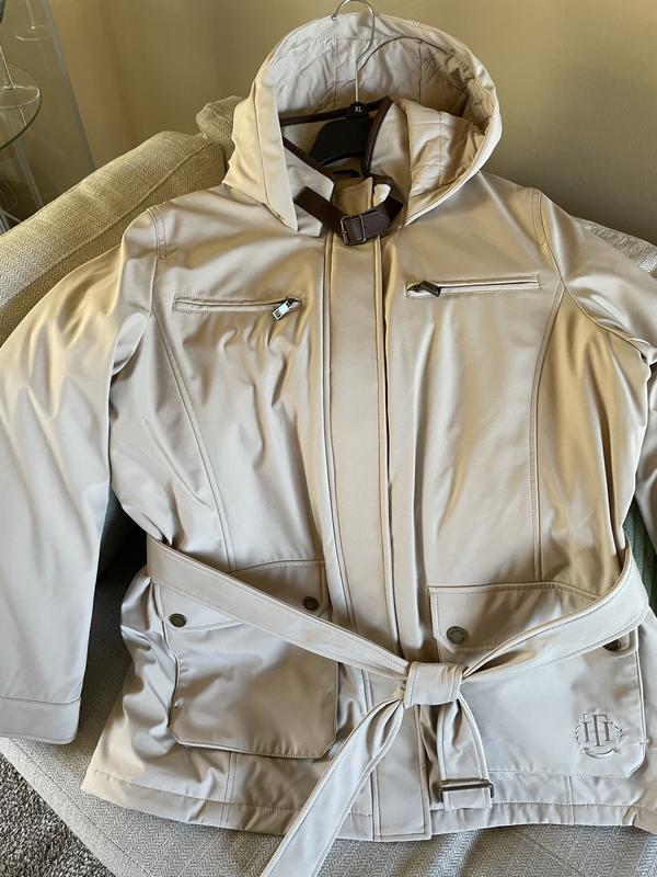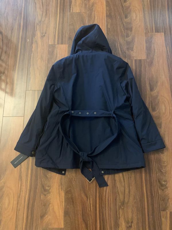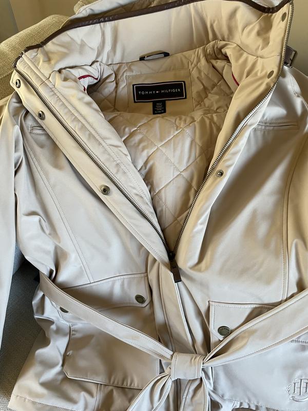 This Tommy Hilfiger rain jacket is super adorable and has many benefits, including the generous pockets and beautiful hood. There is a little belt tie that completes the look. It's very comfortable and warm.