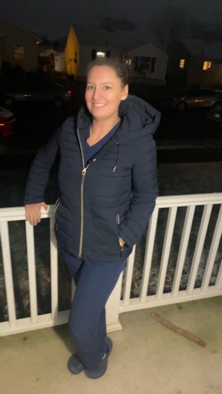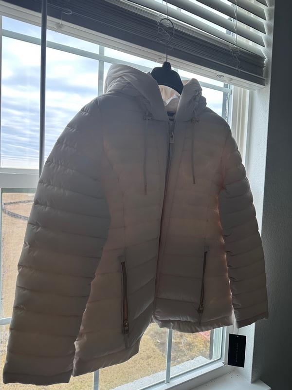 This jacket is warm but so light weight. I got it in the cream color. I purchased it in a size large so that I could wear it with a sweater underneath comfortably.