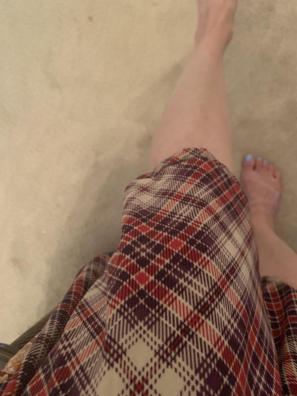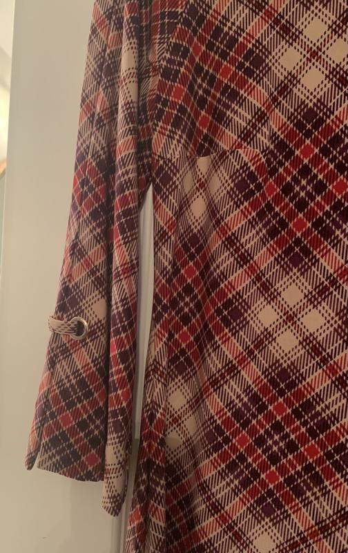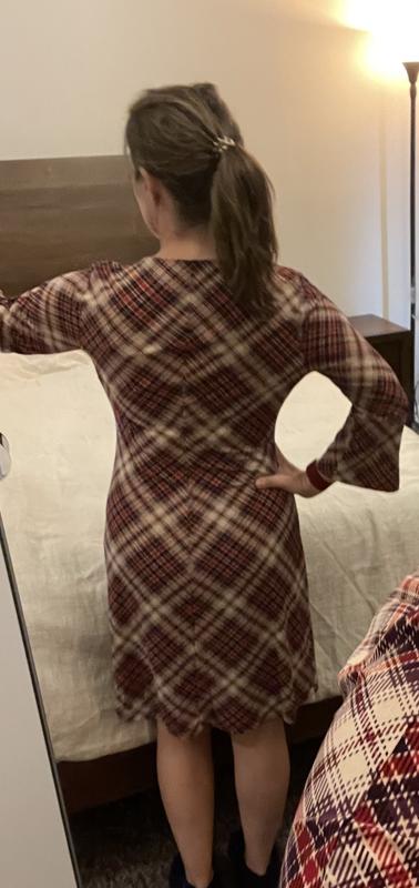 This dress is really flattering, soft and unique fresh plaid. I love plaids and this is a beautiful red and aubergine with light tan background. The fabric is poly but so soft and no cling ! Beautiful fit and length. It is light weight, super comfortable and perfect for fall and holidays. The sleeves are super cute and fashion forward with slight bell and grommets. Very excited to wear this when weather cools down.