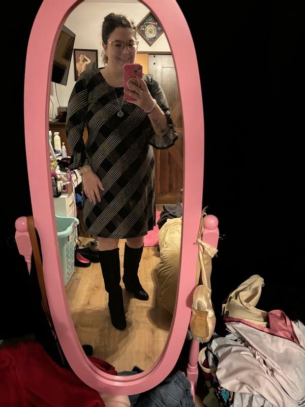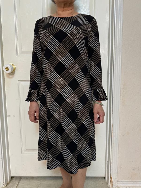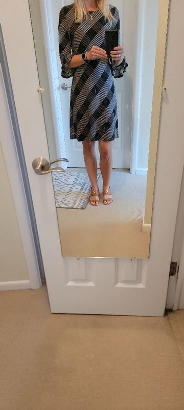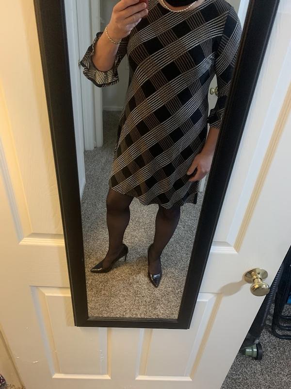 This dress has plenty of stretch and fits like a dream. For reference I am a size 14 with 46 inch hips. The fabric is soft and feels good against my skin. Knee length, this dress can be worn to work, church, or brunch. Pair with a pair of tights and this can be transitioned into the winter. The pattern isn't something I would wear regularly, but it's cute.
