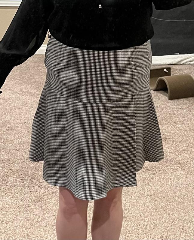 This skirt has excellent structure, shape and the fabric feels good. It looks great on and fits TTS. This is a size 4 and there’s no give in the fabric so keep that in mind. The length is perfect and can be dressed up with tights and flats/heels or down with tennis shoes.