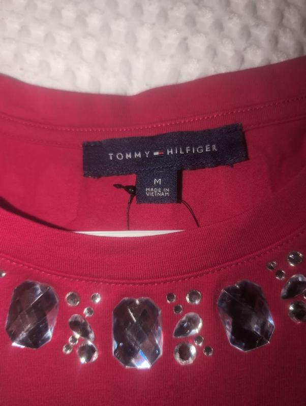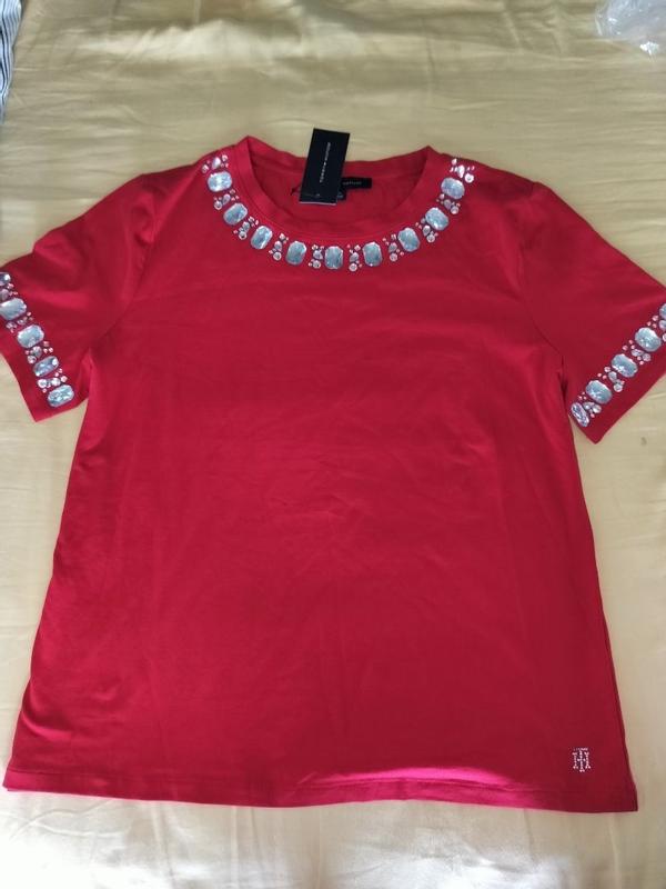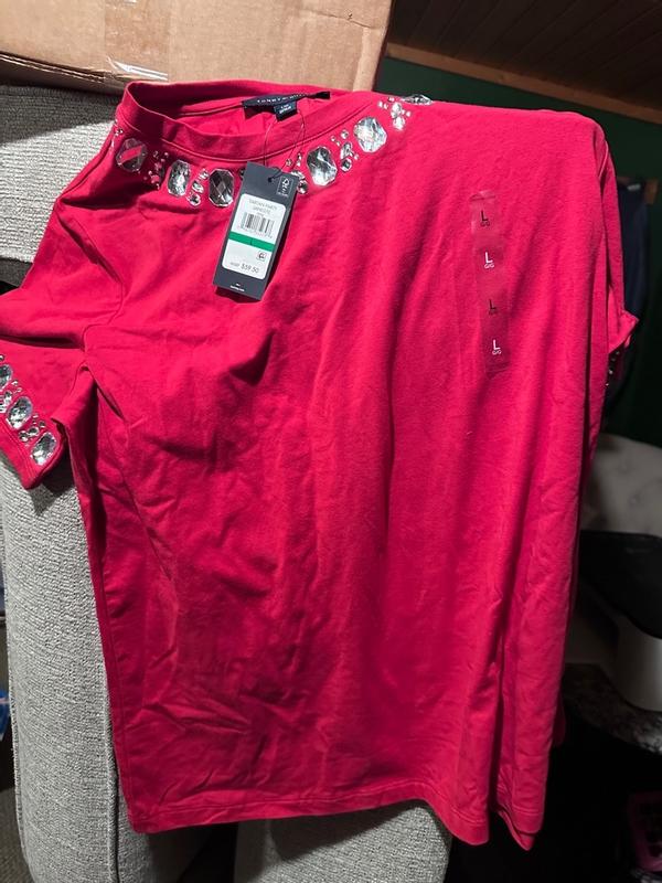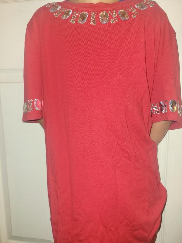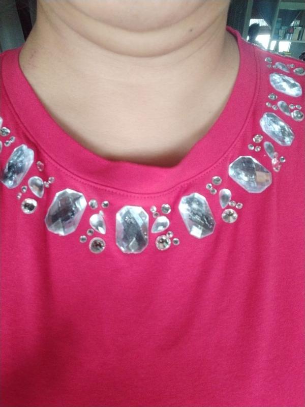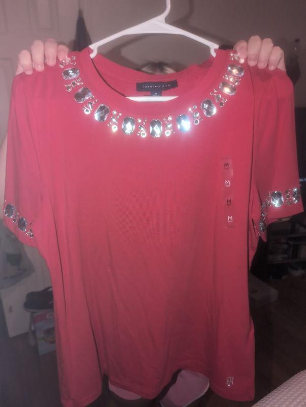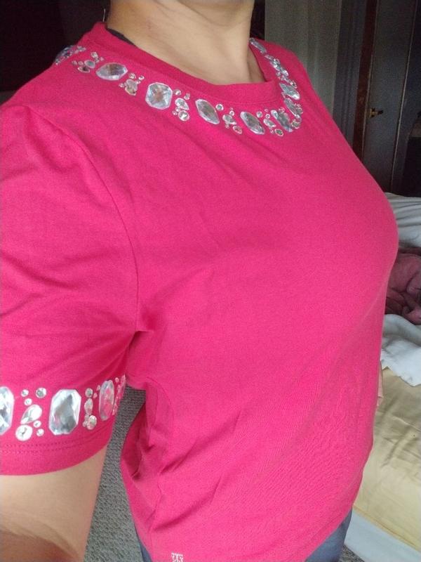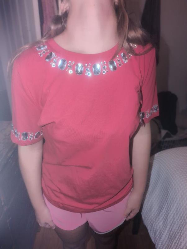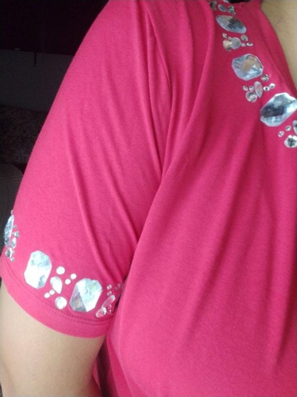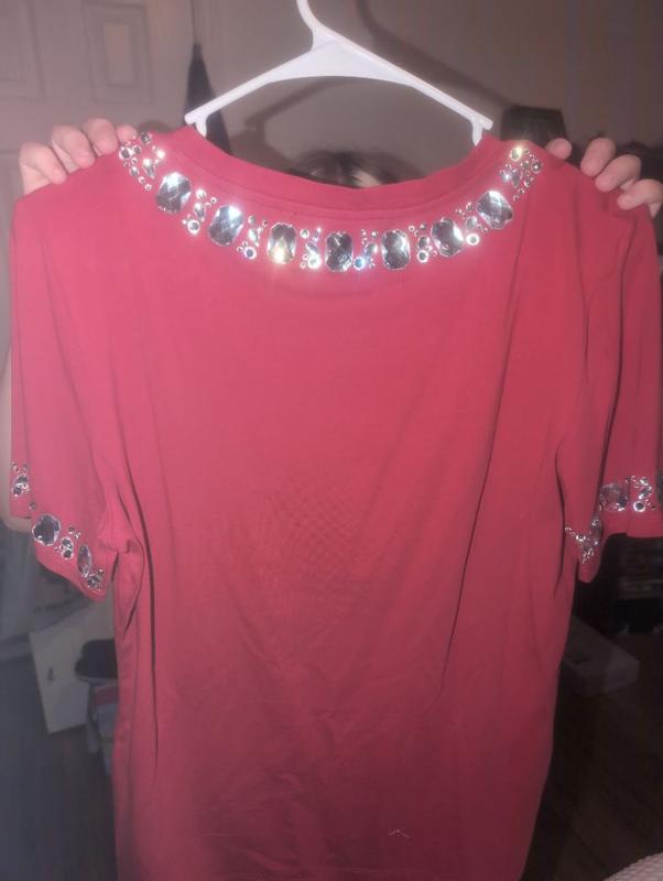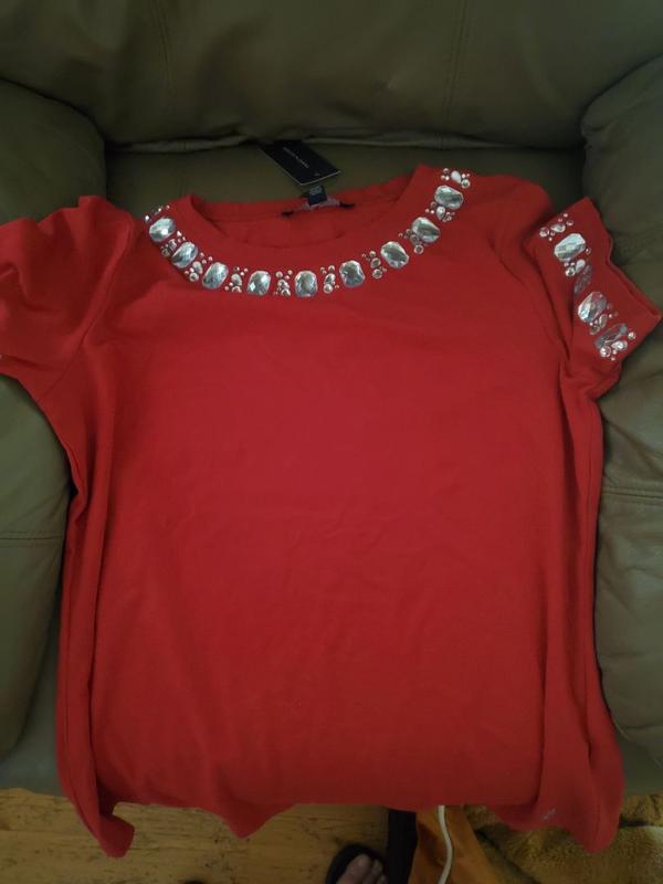 This is a cute, well-made t-shirt. The material is good quality, the rhinestones are pretty large and it can be dressed up or down. It is true to size for me, which is XL.