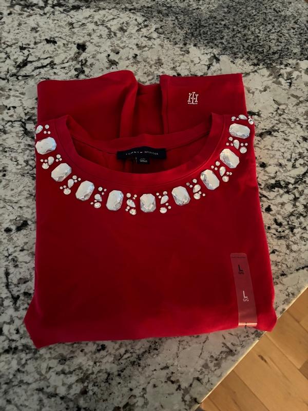 This is a nice quality T-Shirt (Not a Sweater) for some fun bling. Fits well. Ordered a size Large. I bought it on sale for 1/2 off - half price. It is definitely not worth full price but the sale price was okay.
