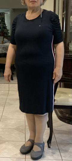 I like the look of this dress, but it's just not working for me. It is "slinky" - and not in a good way. It hugs your body and shows curves and undergarment bumps, even my panty line with a half-slip on. I am 5'3" and 125 pounds. I bought the extra-small in the orange "chili" color. I considered exchanging for a size small, but the sleeves and shoulders fit great. The darker navy dress may be more forgiving and not make any body flaws so noticeable. The orange dress is also very lightweight and slightly sheer.