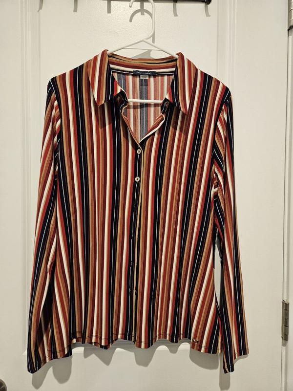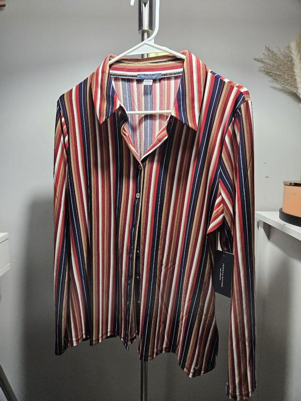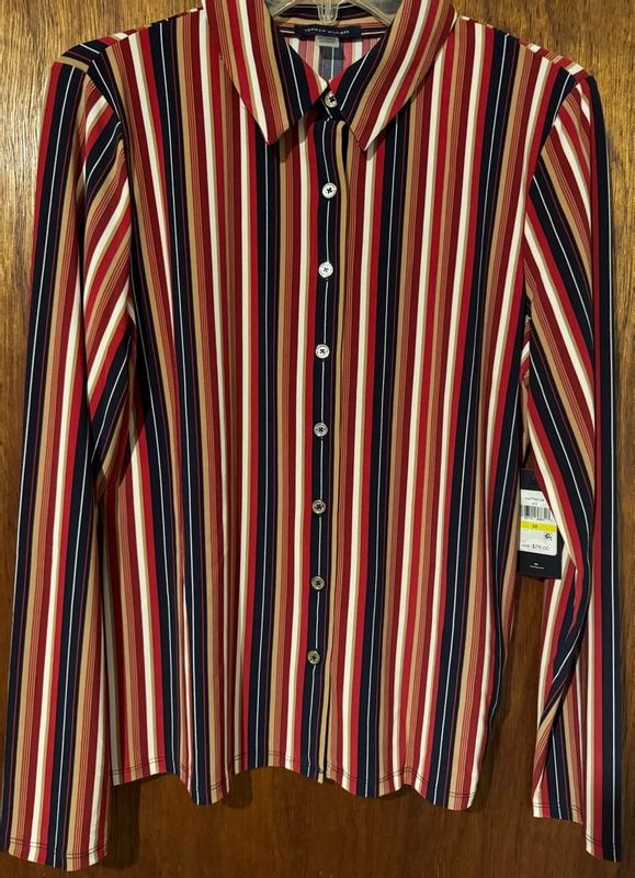 This blouse is a dream! The fit is true and I enjoy the different colors in it to allow me to pair it with a couple of different pairs of slacks I already have.