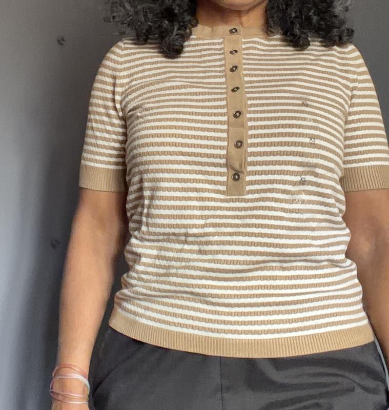 The striped blouse from Tommy Hilfiger with a partial button placket exceeded my expectations. The fit is excellent and very flattering. I am 4’11” tall and weigh 128 pounds, and it fit me perfectly—neither too long nor too loose, which can be challenging for petite sizes. It’s a well-made piece with the quality you expect from Tommy Hilfiger. I would definitely recommend it and would purchase it again.
