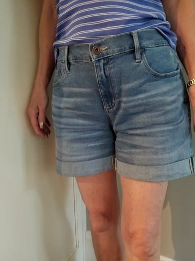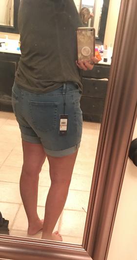 Mid-rise comfortable shorts. Soft denim is great for all day wear. Happy I bought these.