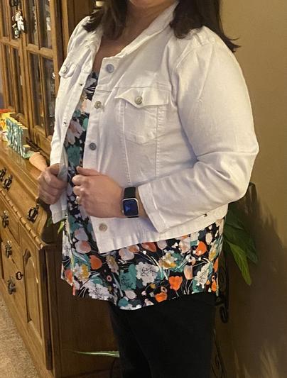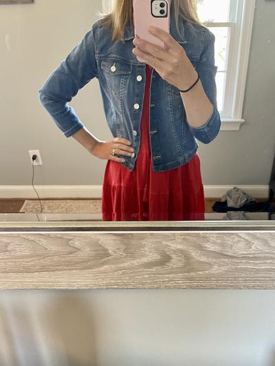 Tommy Hilfiger is among my favorite brands. They are reliable in their products being a good, comfortable fit that’s also flattering. This denim jacket definitely delivers. The sleeves are 3/4 length which I love because I like to wear button up long sleeve blouses and turn the cuffs up over the sleeve hem. I’m 5’7” tall, 155 pounds, 37” bust. The medium is a perfect fit. Very flattering.