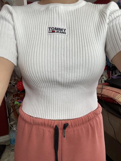Crisp white ribbed detailing across the whole top. A little too cropped for my styling. Runs smaller than expected.