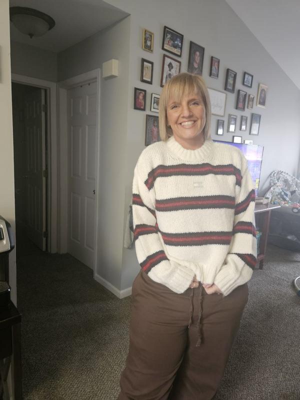 This sweater is perfect! It so soft, warm and comfortable. The material is soft nice! Its cropped but not TOO short. We loved that the logo was all white and didnt stand out too much against the stripes. Great fit, very comfortable!