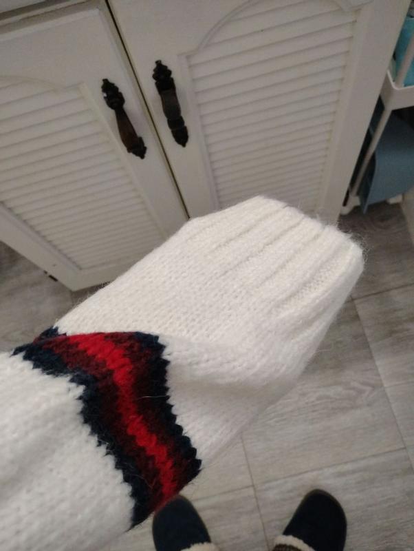 The sweater is cute with nice colors but is a bit itchy, so wearing a shirt under as pictured on the model may be necessary. I had not noticed the beige Tommy logo in the middle of the sweater when I ordered this, and it is a bit distracting and seems out of place.