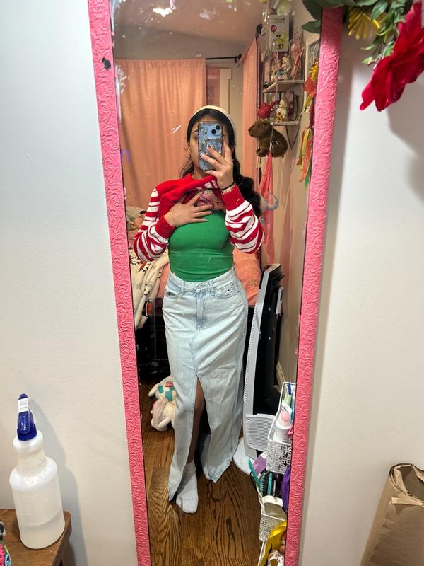 This is a very high quality, durable skirt! The slit adds a really sexy touch. The light denim is perfect for spring and summer. Unfortunately, I will need to size up for this skirt to fit my hips and booty. But I know when I get it in the right size, it'll be perfect and super comfortable!